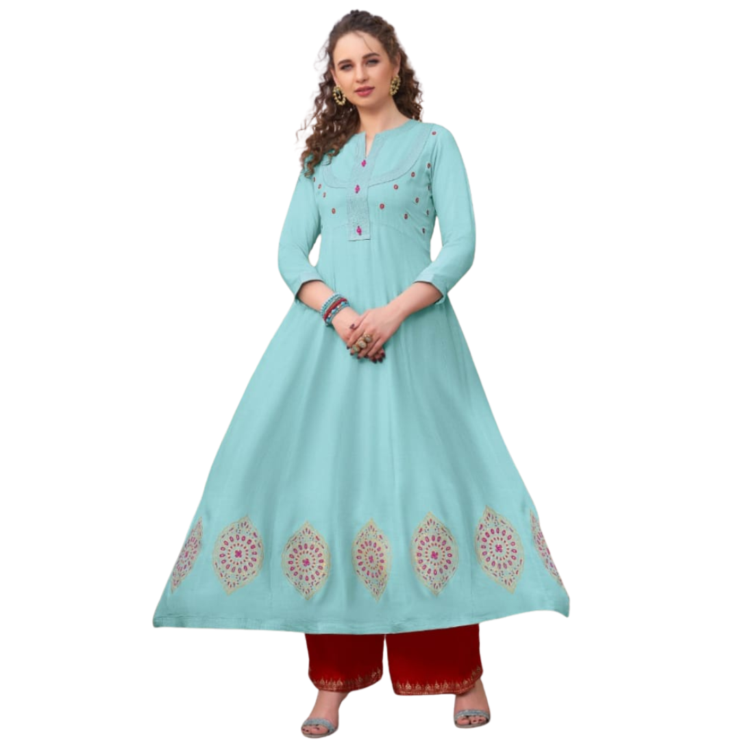 Sky blue Anarkali-style kurta with elegant gold and pink embroidery