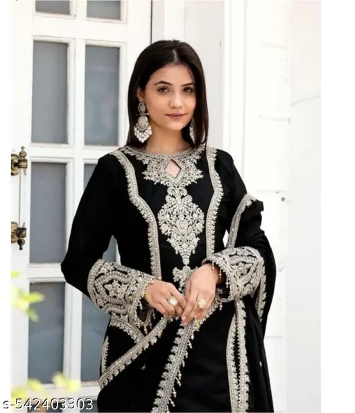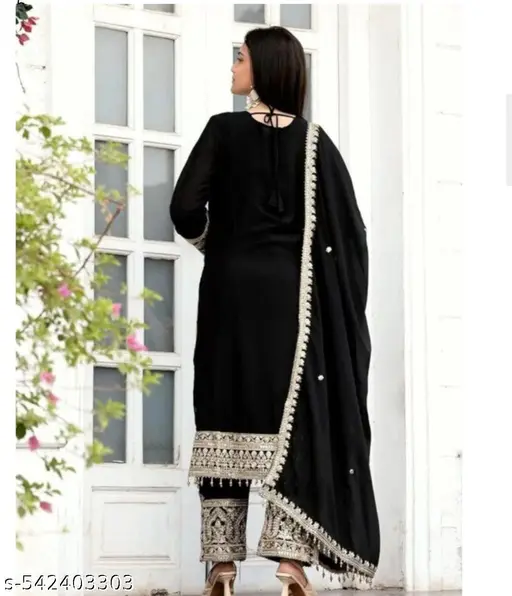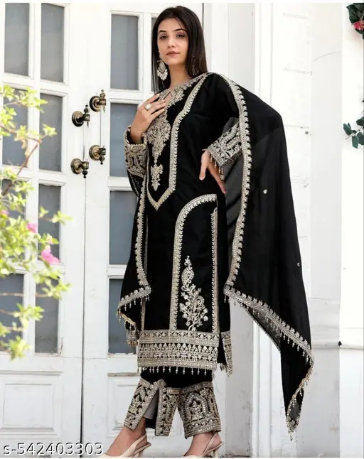 Name : Black Heavy Embroidered Straight Suit Set with Dupatta for Women