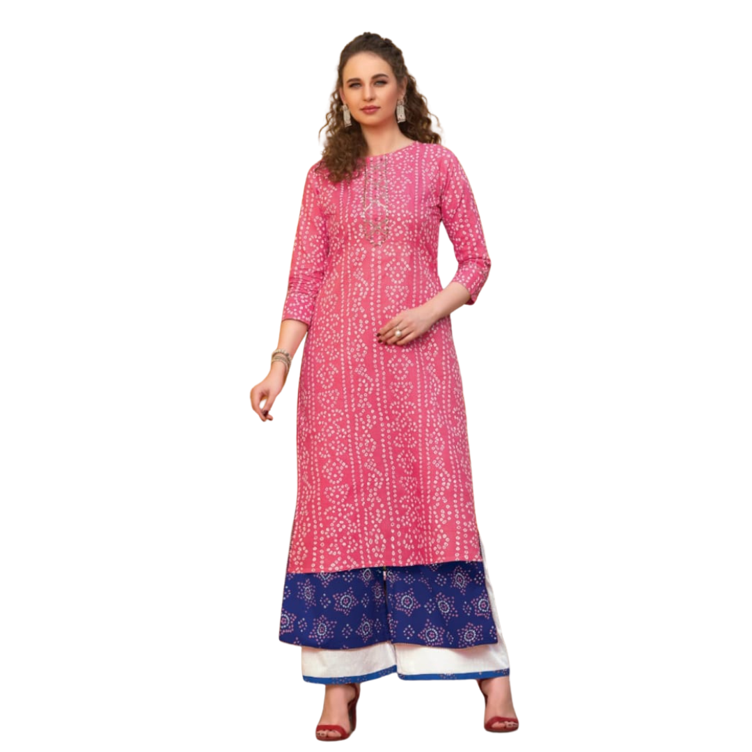 Jazz up your ethnic look with this elegant pink and blue kurti set by Diya Trends a venture of Kajal Style. With an elaborate white traditional print on a bright pink background, the straight-cut kurti is complemented with navy blue palazzo which has the traditional prints of a different color. The ethnic appeal is given a modern touch with the use of the white panel detailing on the palazzo. This outfit consists of soft breathable material, which is suitable on a daily basis, office, college, or light celebratory occasions.
