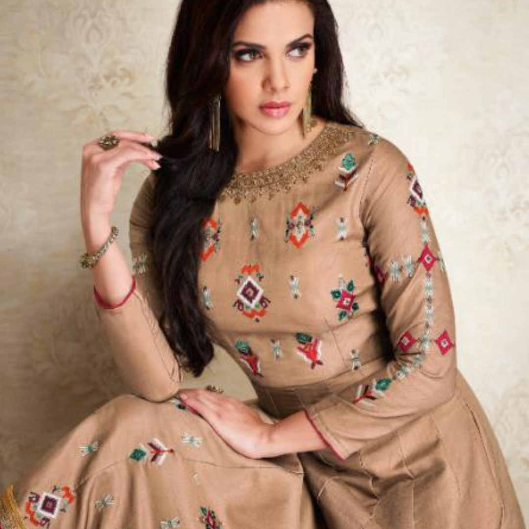 Add a touch of sophistication to your ethnic wardrobe with this Elegant Beige Silk Anarkali Gown. Crafted from high-quality silk, this gown showcases intricate multicolor embroidery across the bodice and sleeves, creating a striking contrast against the subtle beige base. The neckline is beautifully embellished with delicate detailing, enhancing its regal appeal.