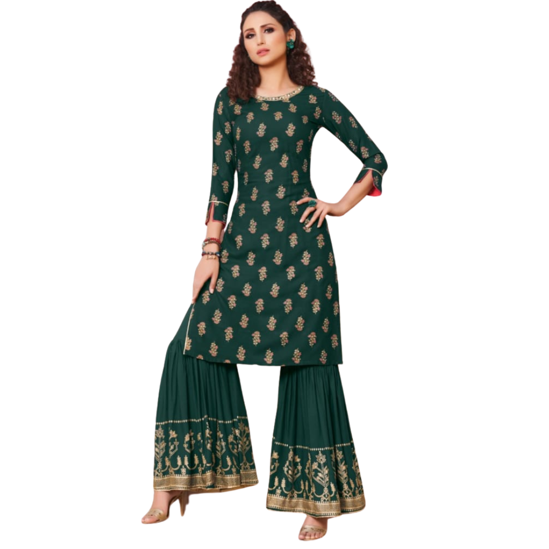 Be the first to review “Elegant Green Printed Kurta with Sharara Set”