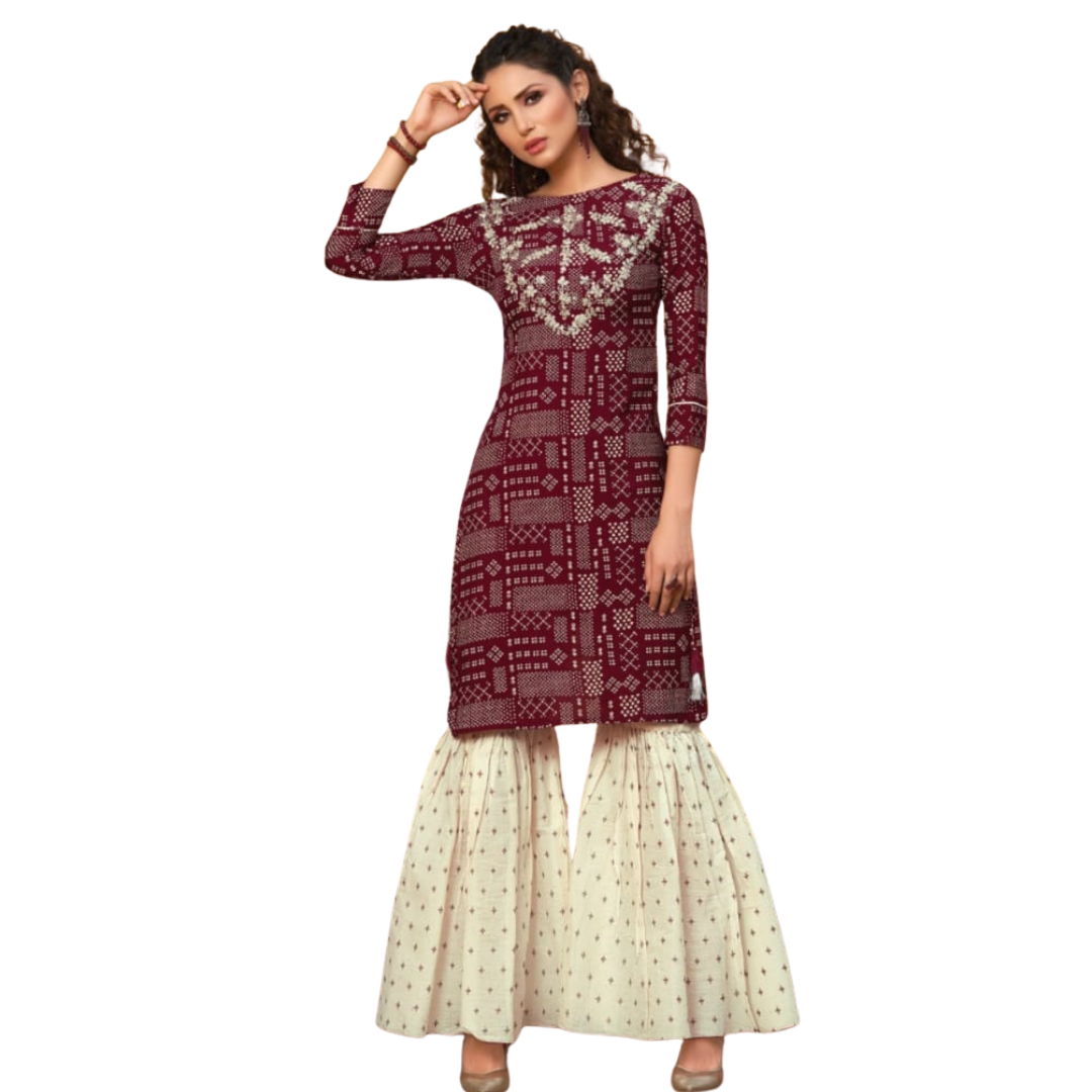 Beautify yourself and look elegant and traditional by donning this Diya Trends by Kayal Style maroon printed sharara set with cream sharara. The design in the kurta is in hybrid geometrical and floral print with elaborate embroidery on the yoke, which is a rich party wear. But to complete the outfit, there is this cream flared sharara smattered with some neatly imprinted maroon spots and lightly accumulated pleats to embody a enormous depth effect. The garment best suits activities involving festivities, conventional celebrations, and family meetings.